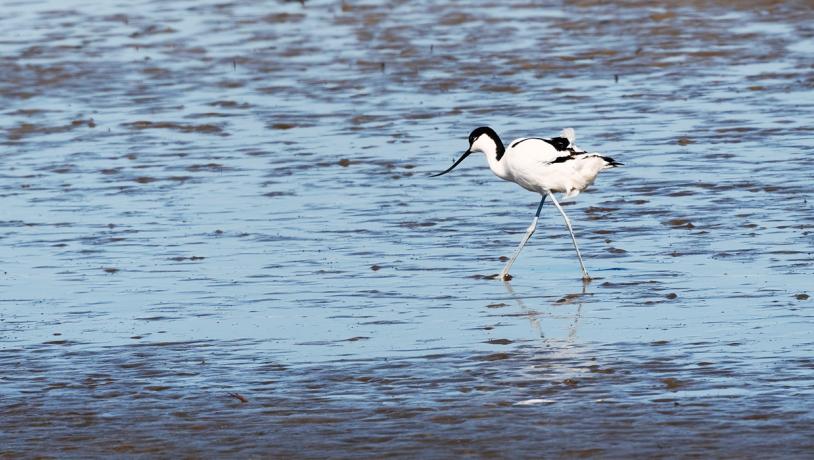The avocet is a slender wading bird with a white body and distinctive black markings on the head, back, and upper wings. Its long, thin, and upwardly curved black bill and light blue legs are characteristic features. Unlike most other waders, the avocet has webbed feet and is a proficient swimmer.