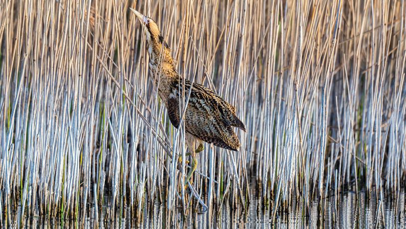 The bittern is a medium-sized heron bird with golden-brown plumage and a wingspan of 125-135 cm. It is a shy bird that hides well in dense reed forests. However, its loud and humming territorial voice, called the timpani, can be heard from several kilometres away in calm weather. The timpani sounds like blowing over an empty bottle and is produced by male bitterns.